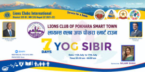 लायन्स क्लब पोखरा स्मार्ट टाउनले मानसिक एवम् शारीरिक स्फूर्तिका लागि आयोजना गरेको ७ दिने योग शिविर आज आइतबार देखि सुरु गरेको छ ।कोरोना महामारीका कारण सिर्जित हुन सक्ने मानसिक तनावसँगै स्वास्थ्य अवस्थालाई मध्यनजर गरेर ७ दिने योग शिविरको आयोजना गरेको संस्थाका अध्यक्ष पवित्रा शर्माले जानकारी दिनुभयो |